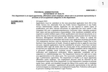 X26 CLEANERS AND X21 ADMINISTRATION CLERKS: DEPARTMENT OF HEALTH CLEANER REF NO: NCDOH 139/2024 (X26 POSTS) SALARY : R131 265 per annum (Level 02) REQUIREMENTS: Abet (Grade 1-9), no experience required. DUTIES: To render general work/cleaning services. Provision of cleaning services – collect and removing of waste papers, freshen office Read more